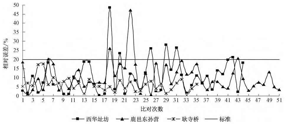 通常认为枯水期、平水期、丰水期3个时期地表水中的有机物和无机物含量的比例会有所差别, 导致转换曲线的适用性不强。结合18个断面的历史数据进行分类筛选, 选取全年水中COD含量较为稳定的站点 (睢县长岗、新野新甸铺) 和最不稳定的站点 (鹿邑东孙营、西华址坊) 3个时期的水样, 利用实验室TOC仪器 (差减法) 分析其中的有机碳和无机碳含量, 确认其比例。数据表明;单个断面3个时期的水体中, 有机碳和无机碳的比例基本保持在固定的比例波动, 枯水期无机碳的比例较低。根据2011年第1周~52周比对数据 (剔除影响比对的断流、停电等因素) , 自动监测数据和手工监测数据相对误差小于20%的达到85%以上。可以认为单个断面3个时期浓度值的波动, 对转换关系产生的影响较小。具体见图5~图7。